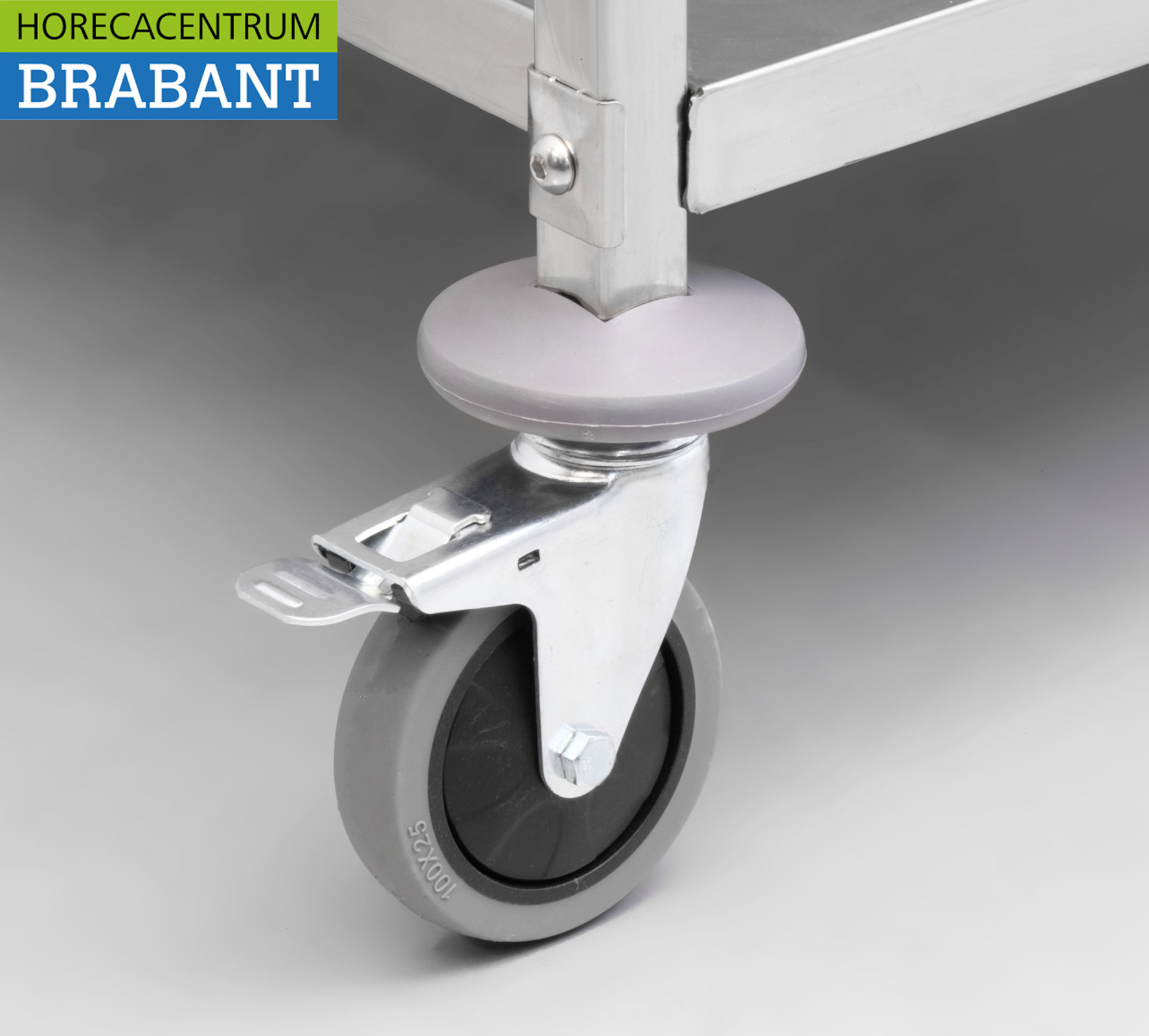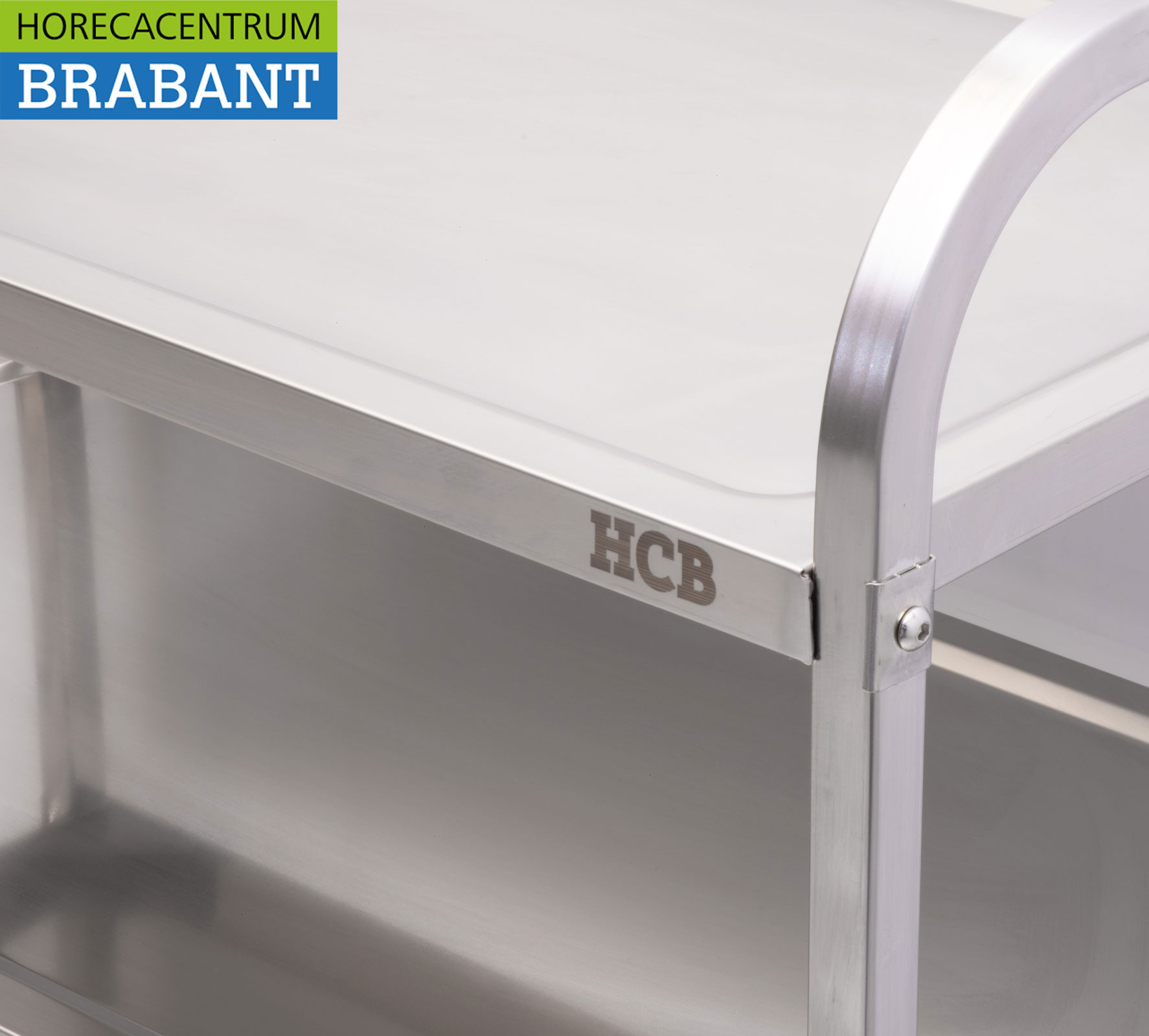 Die drei Arbeitsplatten aus Edelstahl sind an den Ecken zusätzlich verstärkt und verfügen über eine Wassersperre, die das Auslaufen von Flüssigkeiten beim Transport verhindert. Die Vierkantrohre und die Beine mit angeschnittenen Kanten sorgen für zusätzliche Stabilität und Schutz.