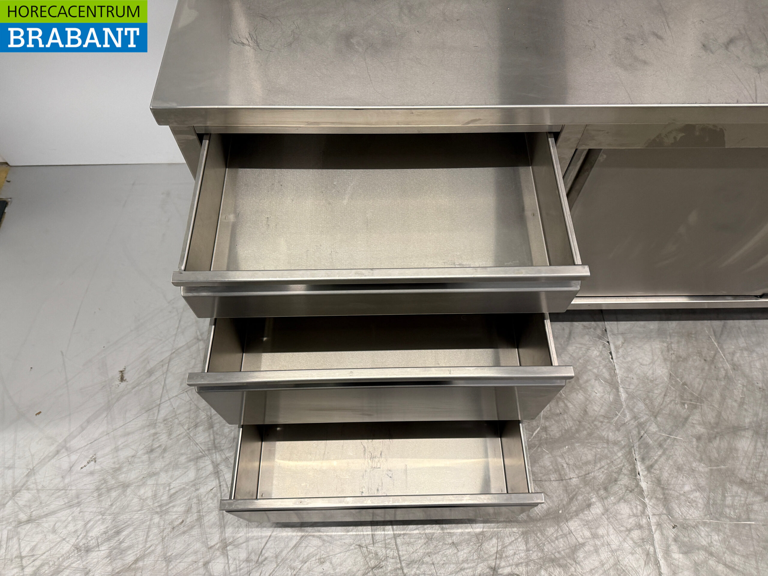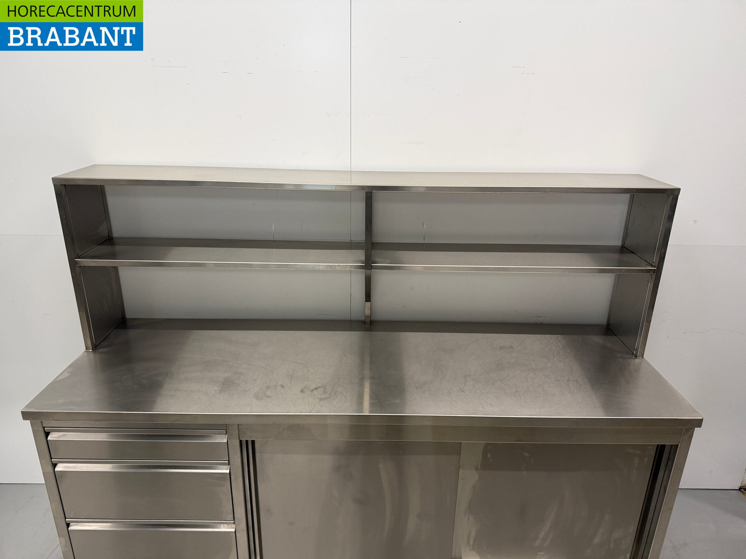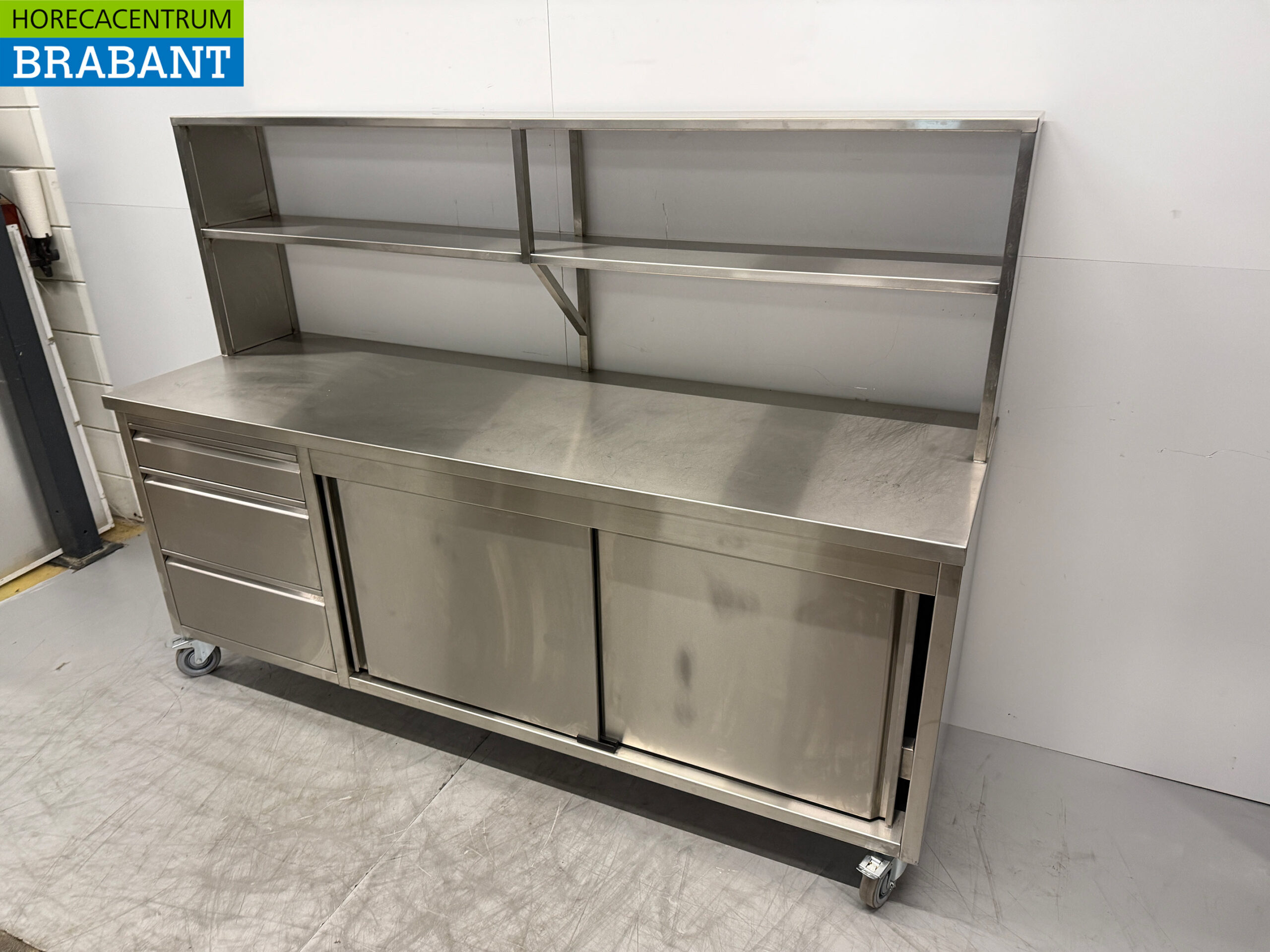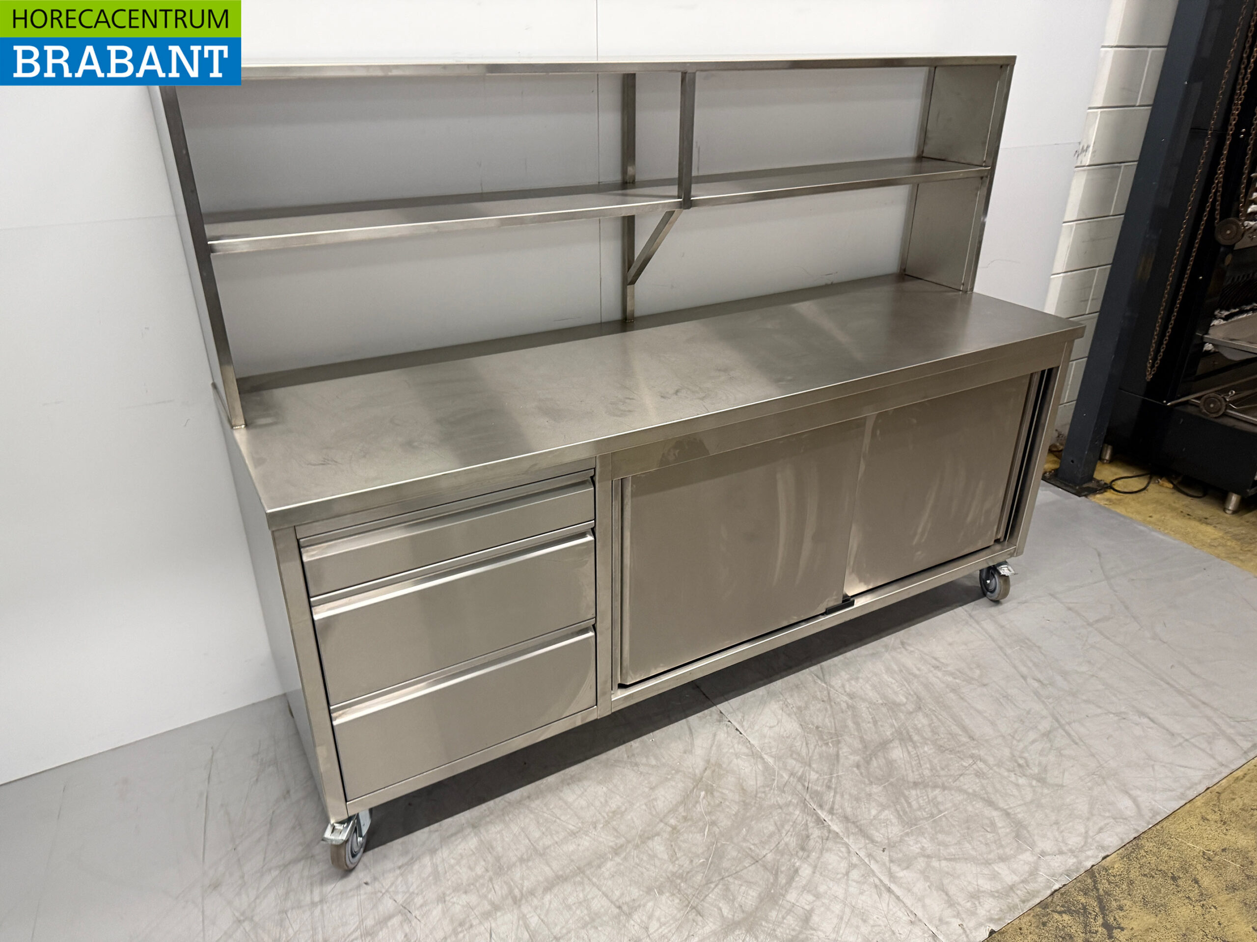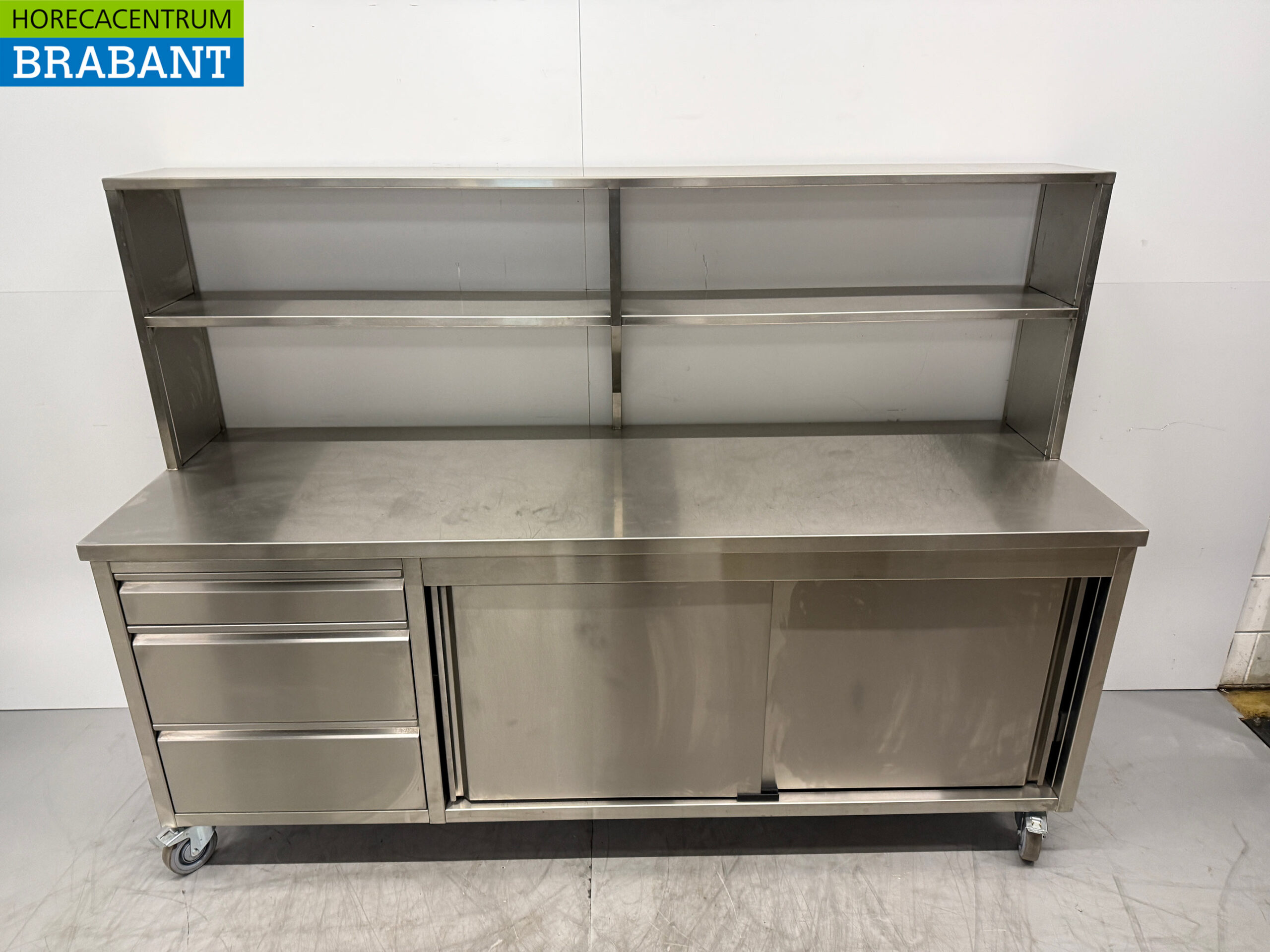 Fahrbarer Arbeitsschrank aus Edelstahl mit Ablagebrücke 220 cm Catering